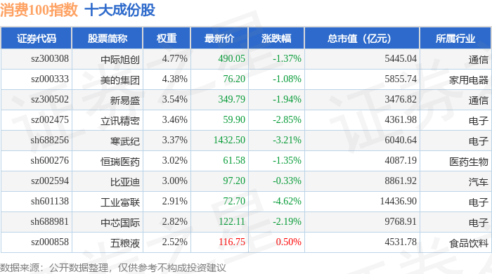 证券之星消息,11月7日,消费100(399364)指数报收于10858.08点,跌1.26%,成交2155.03亿元,换手率1.2%。当日该指数成份股中,上涨的有28家,天孚通信以12.67%的涨幅领涨,下跌的有71家,拓普集团以5.47%的跌幅领跌。