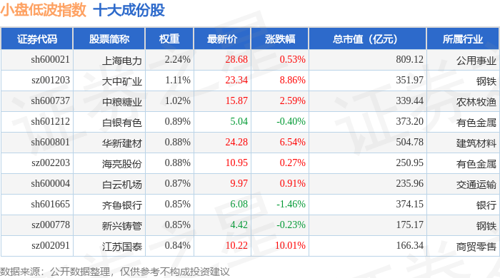 证券之星消息,11月7日,小盘低波(399408)指数报收于15666.67点,涨0.74%,成交500.02亿元,换手率1.39%。当日该指数成份股中,上涨的有89家,江苏国泰以10.01%的涨幅领涨,下跌的有47家,中船防务以2.1%的跌幅领跌。