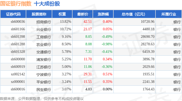 证券之星消息,11月7日,国证银行(399431)指数报收于8141.91点,跌0.14%,成交250.24亿元,换手率0.24%。当日该指数成份股中,上涨的有10家,中信银行以1.38%的涨幅领涨,下跌的有17家,齐鲁银行以1.46%的跌幅领跌。