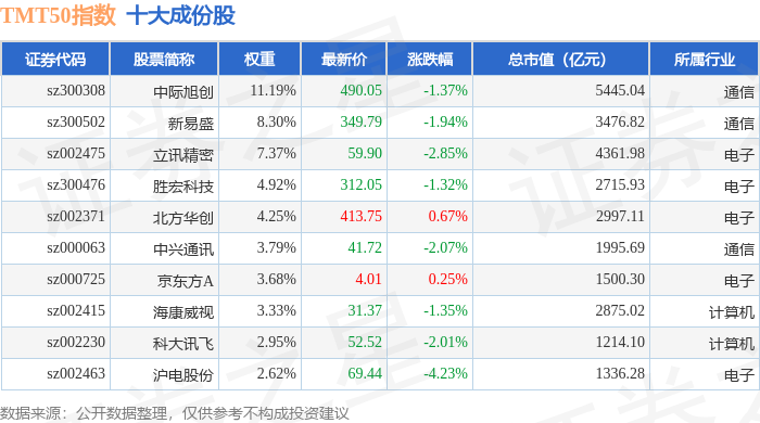 证券之星消息,11月7日,TMT50(399610)指数报收于9247.79点,跌1.47%,成交1311.68亿元,换手率1.7%。当日该指数成份股中,上涨的有7家,天孚通信以12.67%的涨幅领涨,下跌的有43家,沪电股份以4.23%的跌幅领跌。