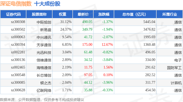 证券之星消息,11月7日,深证电信(399621)指数报收于10552.54点,跌0.49%,成交520.1亿元,换手率2.95%。当日该指数成份股中,上涨的有7家,天孚通信以12.67%的涨幅领涨,下跌的有16家,广和通以4.16%的跌幅领跌。