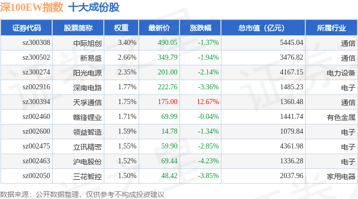 证券之星消息,11月7日,深100EW(399632)指数报收于5279.49点,跌0.39%,成交1987.89亿元,换手率1.12%。当日该指数成份股中,上涨的有36家,天孚通信以12.67%的涨幅领涨,下跌的有60家,沪电股份以4.23%的跌幅领跌。