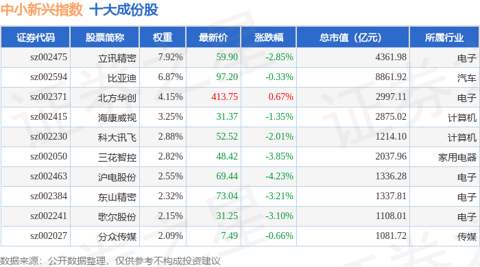 证券之星消息,11月7日,中小新兴(399642)指数报收于2313.1点,跌0.65%,成交1554.97亿元,换手率2.44%。当日该指数成份股中,上涨的有38家,多氟多以10.01%的涨幅领涨,下跌的有60家,科达利以6.15%的跌幅领跌。