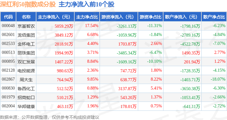 资金流向方面,深红利50(399672)指数成份股当日主力资金净流出合计2.67亿元,游资资金净流出合计6078.36万元,散户资金净流入合计3.27亿元。成份股资金流向详情见下表: