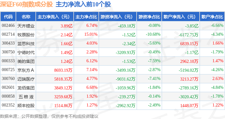 资金流向方面,深证F60(399701)指数成份股当日主力资金净流出合计28.41亿元,游资资金净流入合计4.83亿元,散户资金净流入合计23.58亿元。成份股资金流向详情见下表: