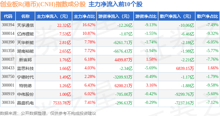 资金流向方面,创业板R(港币)(CNH)(470006)指数成份股当日主力资金净流出合计37.98亿元,游资资金净流入合计11.96亿元,散户资金净流入合计26.02亿元。成份股资金流向详情见下表: