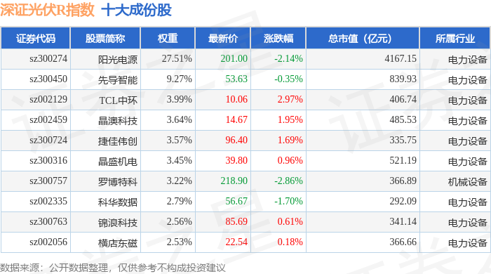 资金流向方面,深证光伏R(470035)指数成份股当日主力资金净流出合计4.52亿元,游资资金净流出合计6992.25万元,散户资金净流入合计5.22亿元。成份股资金流向详情见下表: