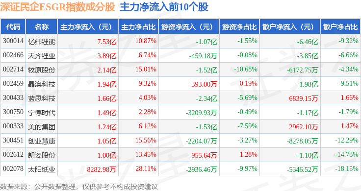 资金流向方面,深证民企ESGR(470056)指数成份股当日主力资金净流出合计26.8亿元,游资资金净流入合计4.49亿元,散户资金净流入合计22.31亿元。成份股资金流向详情见下表: