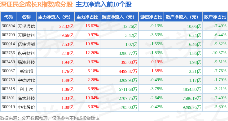 资金流向方面,深证民企成长R(470071)指数成份股当日主力资金净流入合计15.94亿元,游资资金净流出合计6.53亿元,散户资金净流出合计9.4亿元。成份股资金流向详情见下表: