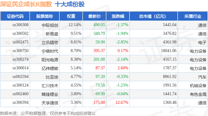 证券之星消息,11月7日,深证民企成长R(470071)指数报收于4426.64点,涨0.19%,成交1267.87亿元,换手率3.4%。当日该指数成份股中,上涨的有23家,天孚通信以12.67%的涨幅领涨,下跌的有27家,科达利以6.15%的跌幅领跌。