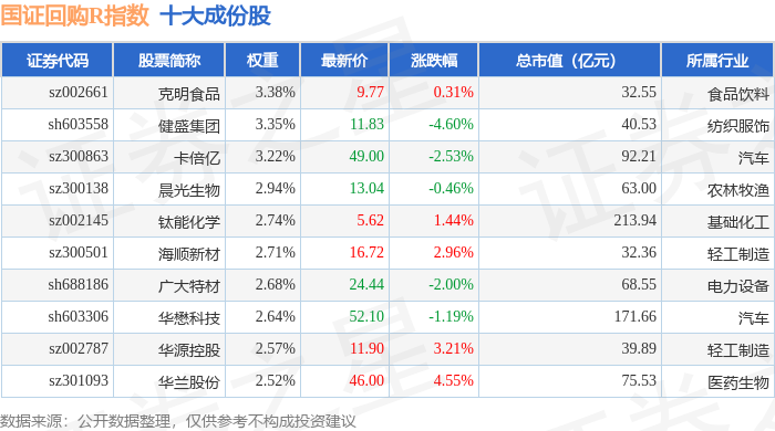 国证回购R(480063)指数十大成份股详情如下: