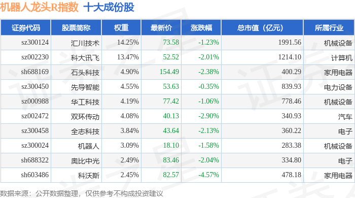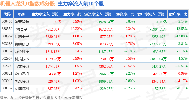 资金流向方面,机器人龙头R(480071)指数成份股当日主力资金净流出合计18.79亿元,游资资金净流入合计5.18亿元,散户资金净流入合计13.61亿元。成份股资金流向详情见下表:
