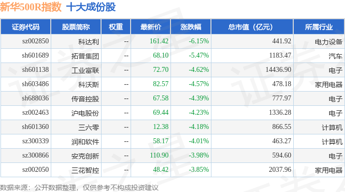 新华500R(489001)指数十大成份股详情如下: