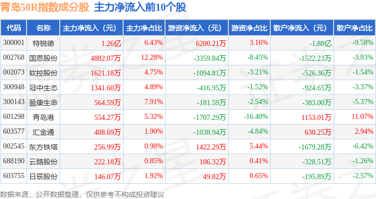 资金流向方面,青岛50R(489011)指数成份股当日主力资金净流出合计8291.99万元,游资资金净流入合计1.16亿元,散户资金净流出合计3286.67万元。成份股资金流向详情见下表: