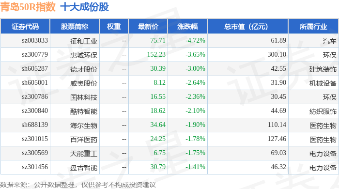 证券之星消息,11月7日,青岛50R(489011)指数报收于2762.61点,涨0.03%,成交98.66亿元,换手率1.58%。当日该指数成份股中,上涨的有16家,国恩股份以9.99%的涨幅领涨,下跌的有24家,征和工业以4.72%的跌幅领跌。