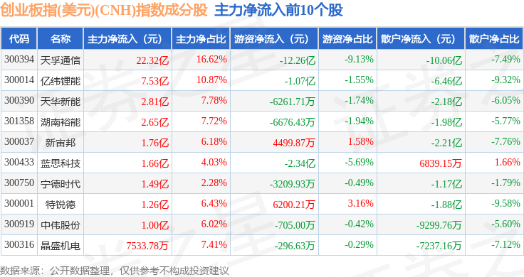 资金流向方面,创业板指(美元)(CNH)(970007)指数成份股当日主力资金净流出合计37.98亿元,游资资金净流入合计11.96亿元,散户资金净流入合计26.02亿元。成份股资金流向详情见下表: