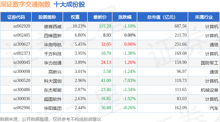 资金流向方面,深证数字交通(970049)指数成份股当日主力资金净流出合计4.11亿元,游资资金净流入合计3.0亿元,散户资金净流入合计1.12亿元。成份股资金流向详情见下表: