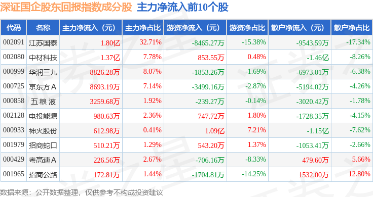 资金流向方面,深证国企股东回报(970064)指数成份股当日主力资金净流出合计5.27亿元,游资资金净流入合计1.28亿元,散户资金净流入合计3.99亿元。成份股资金流向详情见下表: