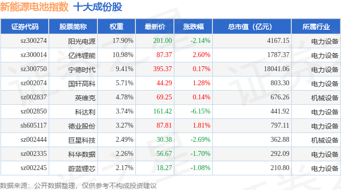 证券之星消息,11月7日,新能源电池(980027)指数报收于3625.31点,跌0.28%,成交670.95亿元,换手率2.84%。当日该指数成份股中,上涨的有21家,科士达以9.99%的涨幅领涨,下跌的有29家,科达利以6.15%的跌幅领跌。