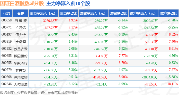资金流向方面,国证白酒(980031)指数成份股当日主力资金净流出合计4.08亿元,游资资金净流入合计1.46亿元,散户资金净流入合计2.62亿元。成份股资金流向详情见下表: