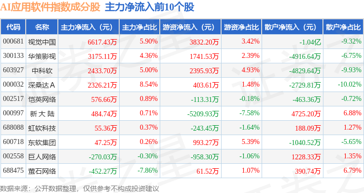 资金流向方面,AI应用软件(980107)指数成份股当日主力资金净流出合计48.39亿元,游资资金净流入合计15.92亿元,散户资金净流入合计32.47亿元。成份股资金流向详情见下表: