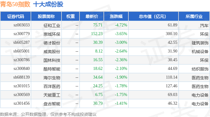 青岛50(989011)指数十大成份股详情如下: