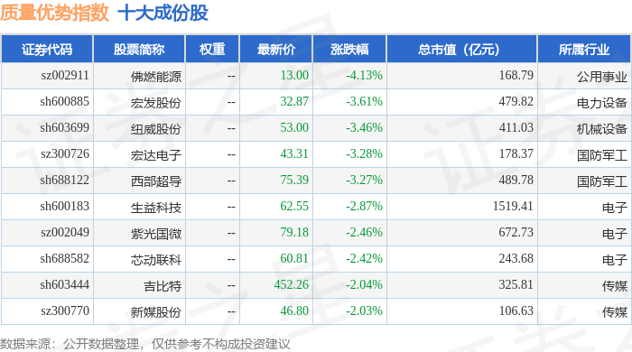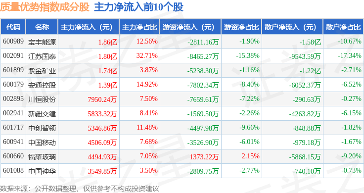资金流向方面,质量优势(989017)指数成份股当日主力资金净流出合计8.09亿元,游资资金净流入合计2.72亿元,散户资金净流入合计5.36亿元。成份股资金流向详情见下表:
