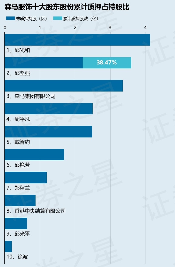 截止本公告日,股东邱坚强已累计质押股份1.38亿股,占其持股总数的38.47%。本次质押后森马服饰十大股东的累计质押股份占持股比例(占持股比例的计算以公司最新一期财务报表公布的十大股东的持股总数为基准)见下图: