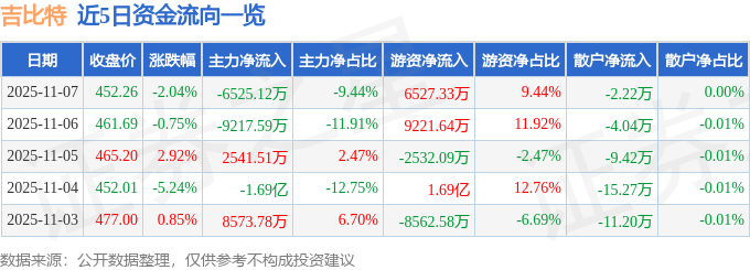 11月7日的资金流向数据方面,主力资金净流出6525.12万元,占总成交额9.44%,游资资金净流入6527.33万元,占总成交额9.44%,散户资金净流出2.22万元。