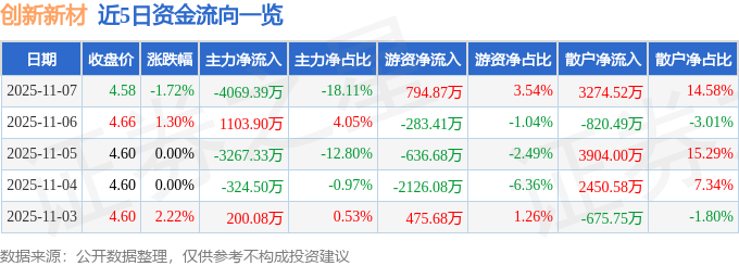 证券之星消息,截至2025年11月7日收盘,创新新材(600361)报收于4.58元,下跌1.72%,换手率3.32%,成交量48.85万手,成交额2.25亿元。