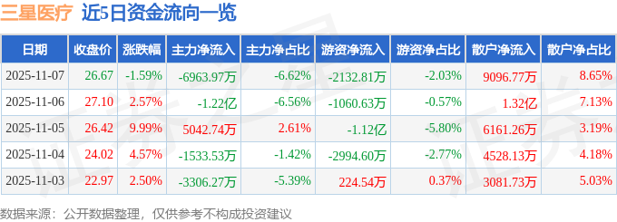 证券之星消息,截至2025年11月7日收盘,三星医疗(601567)报收于26.67元,下跌1.59%,换手率2.79%,成交量39.15万手,成交额10.52亿元。