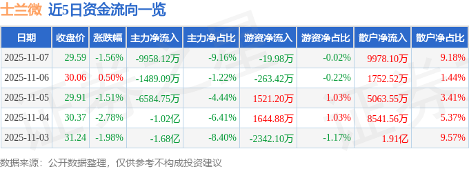 证券之星消息,截至2025年11月7日收盘,士兰微(600460)报收于29.59元,下跌1.56%,换手率2.21%,成交量36.71万手,成交额10.87亿元。