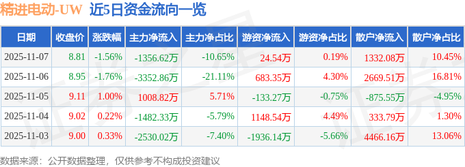 证券之星消息,截至2025年11月7日收盘,精进电动(688280)报收于8.81元,下跌1.56%,换手率2.76%,成交量14.38万手,成交额1.27亿元。