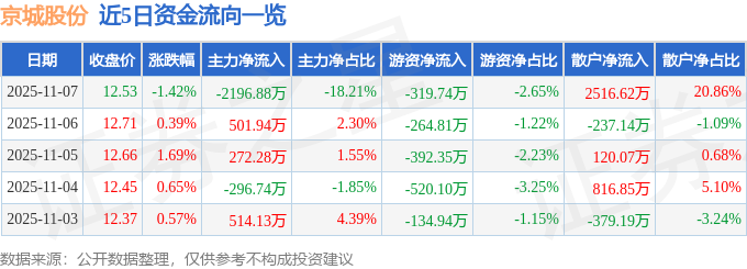 证券之星消息,截至2025年11月7日收盘,京城股份(600860)报收于12.53元,下跌1.42%,换手率2.16%,成交量9.56万手,成交额1.21亿元。