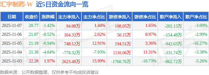 证券之星消息,截至2025年11月7日收盘,汇宇制药(688553)报收于20.77元,下跌1.42%,换手率0.91%,成交量3.14万手,成交额6533.21万元。