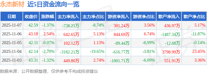 证券之星消息,截至2025年11月7日收盘,永杰新材(603271)报收于42.59元,下跌1.37%,换手率5.03%,成交量1.98万手,成交额8451.07万元。