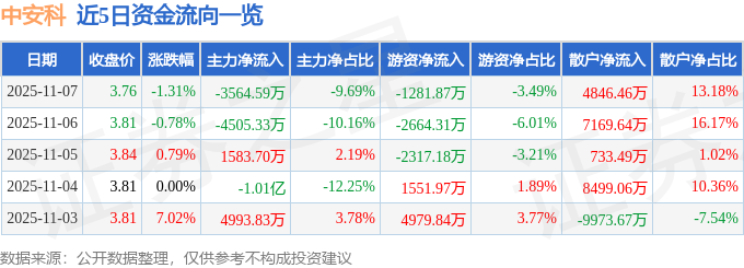 11月7日的资金流向数据方面,主力资金净流出3564.59万元,占总成交额9.69%,游资资金净流出1281.87万元,占总成交额3.49%,散户资金净流入4846.46万元,占总成交额13.18%。