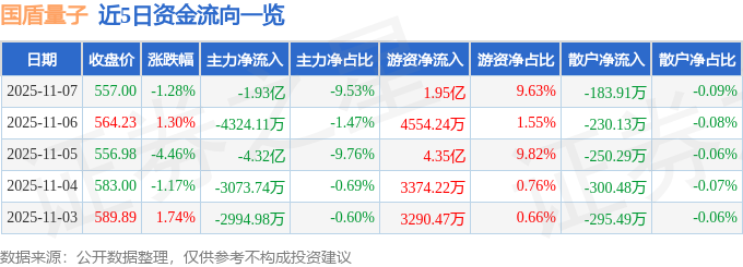 证券之星消息,截至2025年11月7日收盘,国盾量子(688027)报收于557.0元,下跌1.28%,换手率4.54%,成交量3.65万手,成交额20.25亿元。
