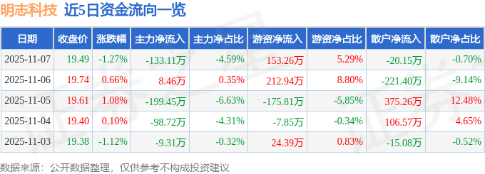 证券之星消息,截至2025年11月7日收盘,明志科技(688355)报收于19.49元,下跌1.27%,换手率1.2%,成交量1.49万手,成交额2897.68万元。