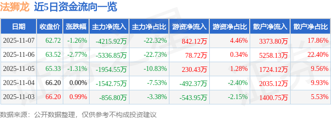 证券之星消息,截至2025年11月7日收盘,法狮龙(605318)报收于62.72元,下跌1.26%,换手率2.4%,成交量3.01万手,成交额1.89亿元。