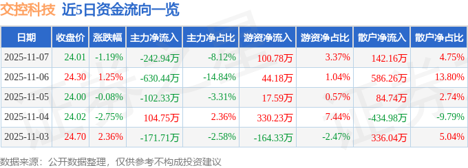 证券之星消息,截至2025年11月7日收盘,交控科技(688015)报收于24.01元,下跌1.19%,换手率0.66%,成交量1.25万手,成交额2990.86万元。