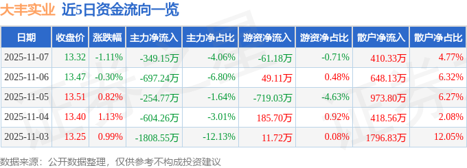 证券之星消息,截至2025年11月7日收盘,大丰实业(603081)报收于13.32元,下跌1.11%,换手率1.53%,成交量6.45万手,成交额8601.08万元。