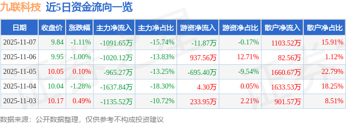 证券之星消息,截至2025年11月7日收盘,九联科技(688609)报收于9.84元,下跌1.11%,换手率1.41%,成交量7.04万手,成交额6934.62万元。