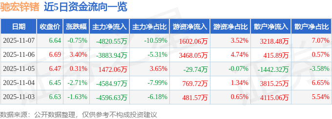证券之星消息,截至2025年11月7日收盘,驰宏锌锗(600497)报收于6.64元,下跌0.75%,换手率1.36%,成交量68.69万手,成交额4.55亿元。