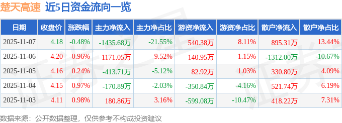证券之星消息,截至2025年11月7日收盘,楚天高速(600035)报收于4.18元,下跌0.48%,换手率0.99%,成交量15.91万手,成交额6663.29万元。