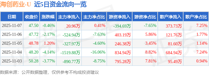证券之星消息,截至2025年11月7日收盘,海创药业(688302)报收于47.5元,下跌0.46%,换手率1.1%,成交量1.09万手,成交额5158.08万元。