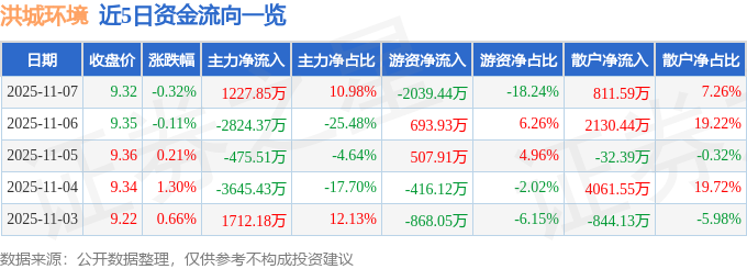 证券之星消息,截至2025年11月7日收盘,洪城环境(600461)报收于9.32元,下跌0.32%,换手率0.93%,成交量11.94万手,成交额1.12亿元。