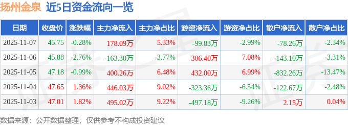 证券之星消息,截至2025年11月7日收盘,扬州金泉(603307)报收于45.75元,下跌0.28%,换手率4.28%,成交量7279.0手,成交额3341.95万元。