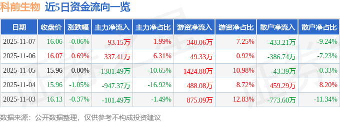 证券之星消息,截至2025年11月7日收盘,科前生物(688526)报收于16.06元,下跌0.06%,换手率0.63%,成交量2.92万手,成交额4690.37万元。