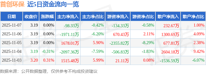 证券之星消息,截至2025年11月7日收盘,首创环保(600008)报收于3.19元,上涨0.0%,换手率0.99%,成交量72.52万手,成交额2.32亿元。